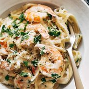 - Finish: Add the shrimp, whipping cream, Parmesan, and parsley to the cooked pasta. Toss everything together and finish with a squeeze of lemon juice, salt, and pepper.